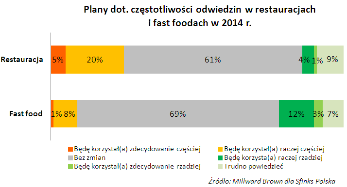 W tym roku restauracjom w Polsce przybędzie więcej klientów niż fast foodom - wynika z badania przeprowadzonego przez Millward Brown na zlecenie Sfinks Polska. Co czwarta (25%) osoba korzystająca z usług gastronomicznych zamierza w 2014 r. jadać w restauracjach częściej niż do tej pory. W fast foodach chce jadać częściej tylko co jedenasty badany (9%), a 15% chce w nich bywać rzadziej. Co istotne, badanie zrealizowane na zlecenie właściciela sieci Sphinx, Chłopskie Jadło i WOOK pokazuje, że w największym stopniu swoje przyzwyczajenia gastronomiczne mają zamiar zmienić klienci pomiędzy 20 a 24 rokiem życia. Aż cztery osoby na dziesięć (41%) z tej grupy planują w 2014 r. częściej jadać w restauracjach i aż 46% deklaruje, że w tym roku będzie rzadziej niż do tej pory odwiedzać fast foody.