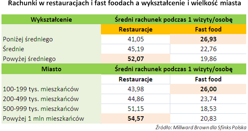 Kto i ile wydaje w lokalach gastronomicznych? Badanie Millward Brown zrealizowane na zlecenie Sfinksa pokazuje, że klienci jadający poza domem zostawiają podczas jednej wizyty w restauracjach średnio 48,29 zł na osobę, a w lokalach szybkiej obsługi 22,78 zł na osobę, przy czym mężczyźni wydają więcej w fast foodach, a kobiety w restauracjach. Analizując skłonność do wydawania pieniędzy w podziale na wykształcenie i miejsce zamieszkania okazuje się, że w najwięcej na posiłek w restauracji przeznaczają osoby z wykształceniem powyżej średniego (52,07 zł/osobę) oraz mieszkające w miastach powyżej 1 mln mieszkańców (54,57 zł), co w praktyce oznacza Warszawę. Z kolei w lokalach szybkiej obsługi najwyższe rachunki deklarują osoby z wykształceniem poniżej średniego (26,93 zł) oraz mieszkańcy miast o populacji od 100 do 199 tysięcy (26 zł).