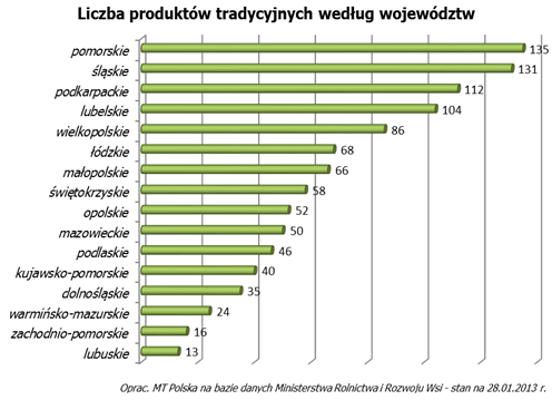 Polska to kraj z bogatym dziedzictwem kulinarnym. Na liście tradycyjnych produktów jest aktualnie 1036 wyrobów, które powstają na bazie unikatowych receptur przekazywanych z pokolenia na pokolenie i są głęboko zakorzenione w tradycji i kulturze poszczególnych regionów. Najwięcej artykułów zarejestrowanych jest w województwie pomorskim – 135 wyrobów. Drugie w kolejności, z liczbą 131 produktów, jest województwo śląskie, a trzecią lokatę na podium zajmuje województwo podkarpackie - 112 wyrobów. Na końcu stawki są zaś województwo lubuskie (13 produktów tradycyjnych), zachodnio-pomorskie (16 artykułów), a także warmińsko-mazurskie (24 wyroby).  Na listę produktów tradycyjnych wpisywane są artykuły, których jakość czy unikatowe cechy są wynikiem stosowania tradycyjnych metod produkcji, wykorzystywanych przynajmniej od 25 lat. Co więcej, produkty te są składnikiem kulturowego dziedzictwa regionu, z jakiego pochodzą i stanowią element tożsamości lokalnej społeczności. Lista produktów tradycyjnych prowadzona jest przez Ministra Rolnictwa i Rozwoju Wsi oraz marszałków poszczególnych województw. Ma na celu promocję wyrobów, które zostały wytworzone w oparciu o tradycyjne metody.